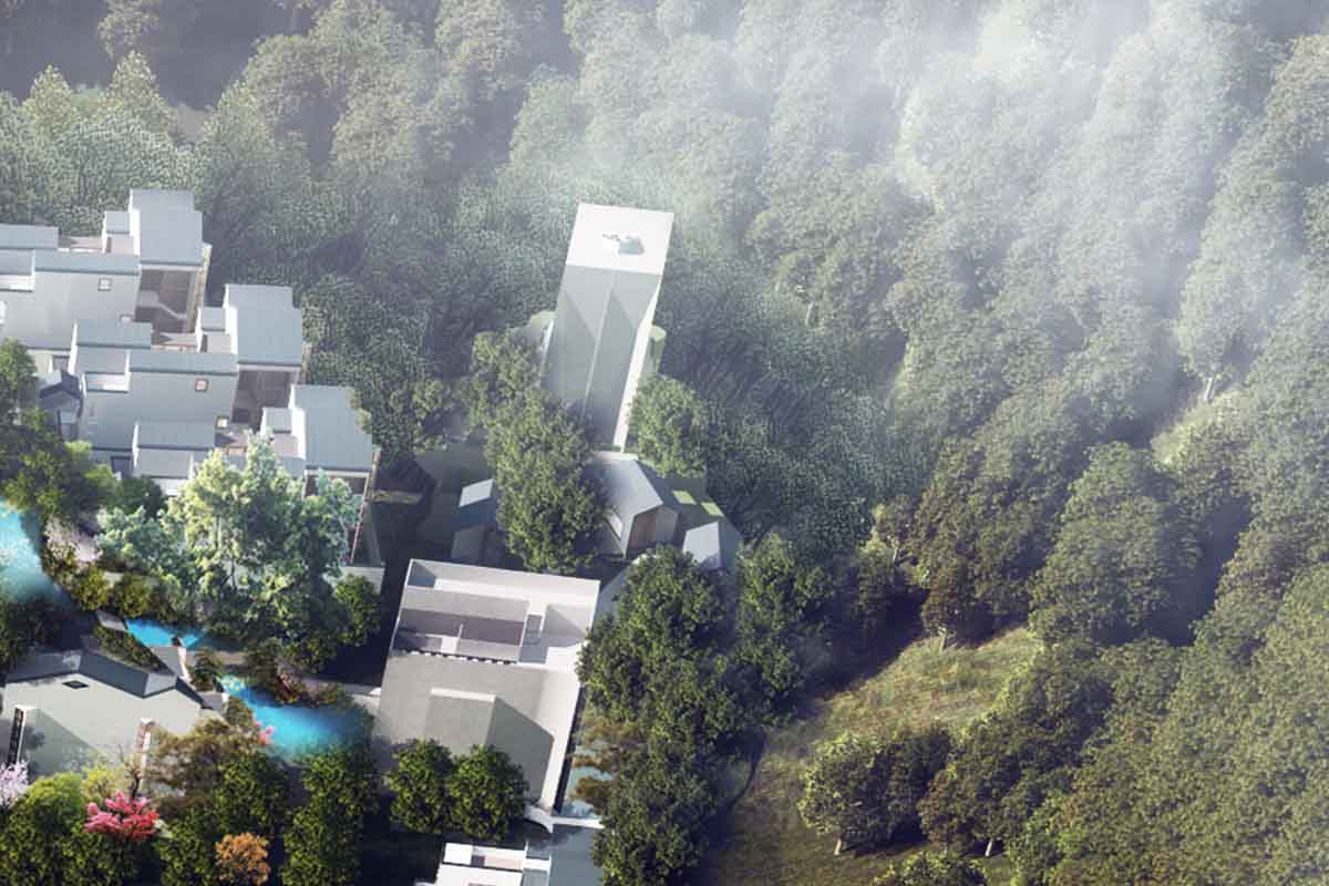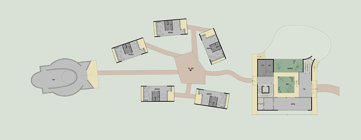 现代都市生活压力日渐增大,人们也在寻找静心、修心、养性的禅修场所,而借此机缘,项目在山脚下建造了供未出家但对禅修有兴趣的人进行禅修的主题酒店。