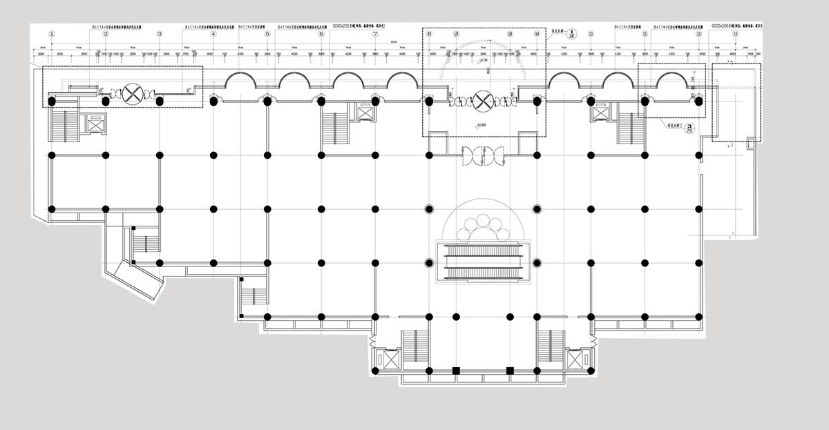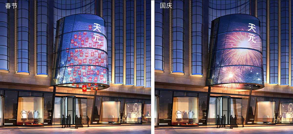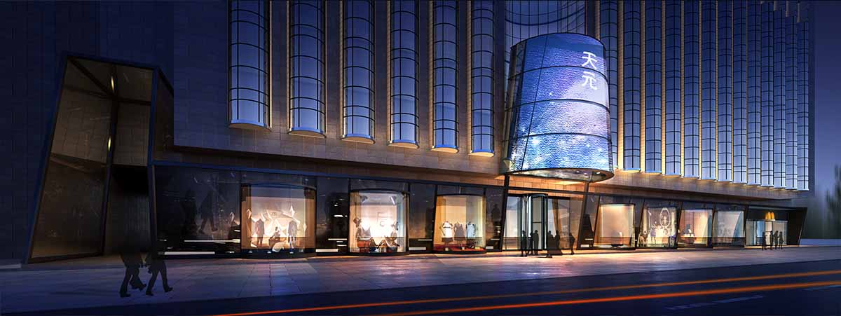 项目的改造设计对于主立面是通过更换石材及门窗材料维持原主立面,但增加了夜景灯光设置。设计的重点是在主入口和沿街橱窗部分,通过大尺度的弧形夹胶玻璃和镀膜玻璃,形成了沿街的视觉焦点。而主入口高耸的玻璃空间也为商场应节应季气氛营造提供了自由转换场景的便利性,使其符合当代商业建筑的秉性。