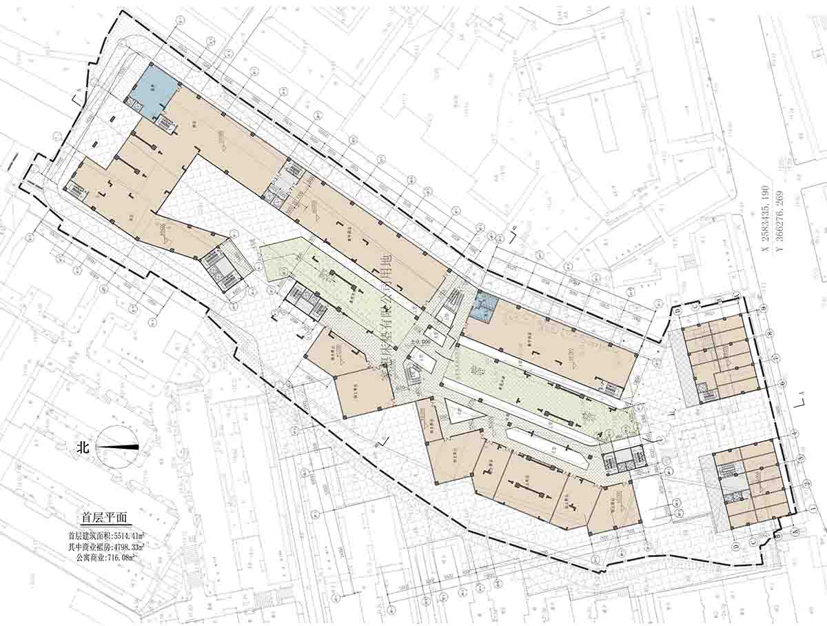 这是一个90年代建成的旧城改造项目。项目位于旧城中心,通过对城市肌理的重新梳理,形成了纵深方向的商业内街这一方案。