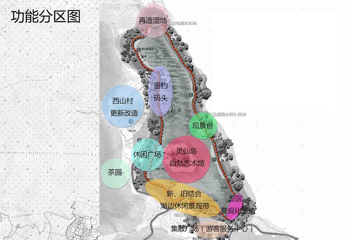 把原有建筑物和构筑物进行重新的场景组织,形成包括岛上艺术馆、茶园茶室、环湖绿道、垂钓平台、休息站等,并恢复原有湿地,使人群能享受轻松、愉快、悠游的有品质的城市休闲健康生活。