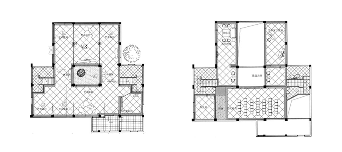 本设计恢复了建筑的所有天井空间,使其成为空间核心,并环绕其设置了展陈空间,使得在其中参观的游客以一种舒适放松的心情观看展览,反映的是一种艺术就在生活中的观念。整个空间由两把连通一、二层的楼梯串连起来,一方面享有不同高度的视觉转变,另一方面,也为项目办公、展览、沙龙举办等提供了便利性。
