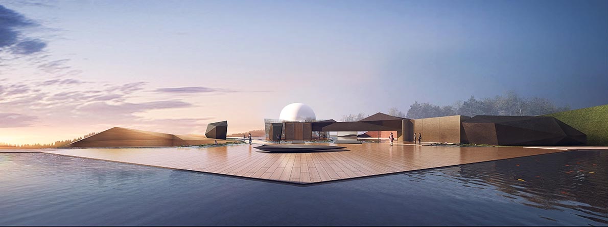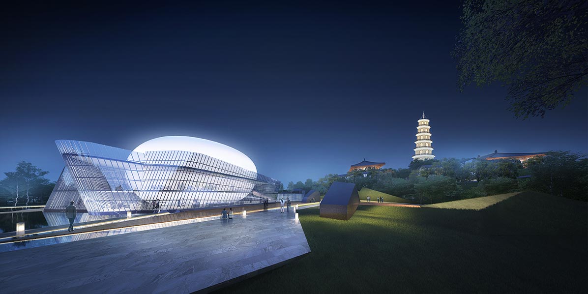 故,新轴线与传统中轴以雁塔寺为交点,45°夹角而生成,场地内建筑,如市民广场、音乐厅、书院、博物馆等则采取“中轴自由”的形态镶嵌于内。