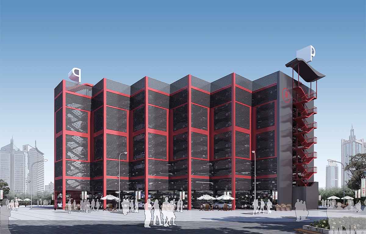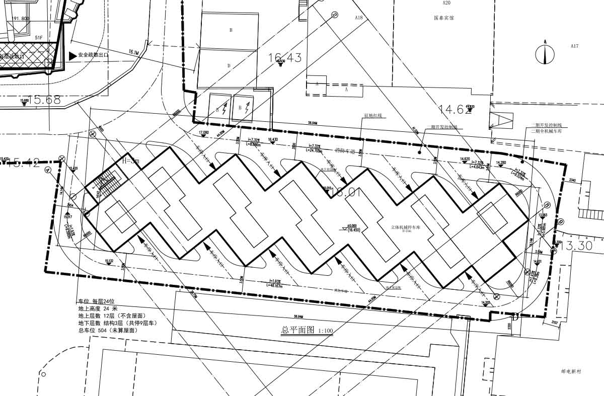本项目是场地留下的唯一一块狭长地块,经过综合推算,需建21层的高层停车库才可满足停车指标。综合建筑高度及施工条件,设计了地上12层地下9层——“上天下地式”的机械停车方式解决此问题。