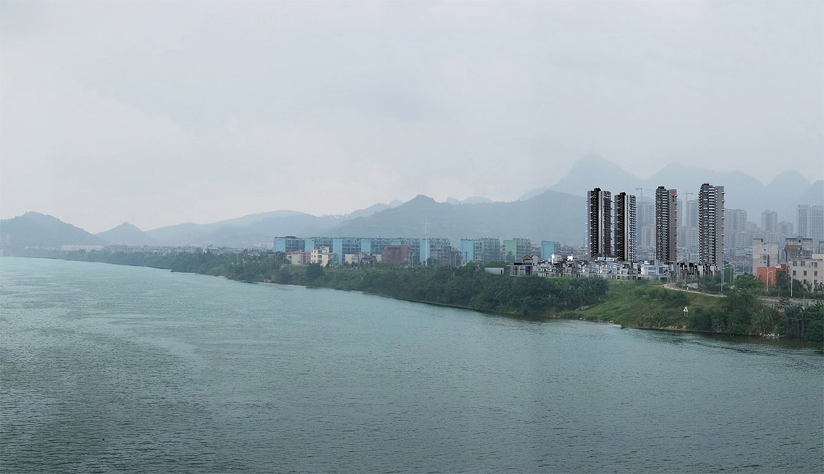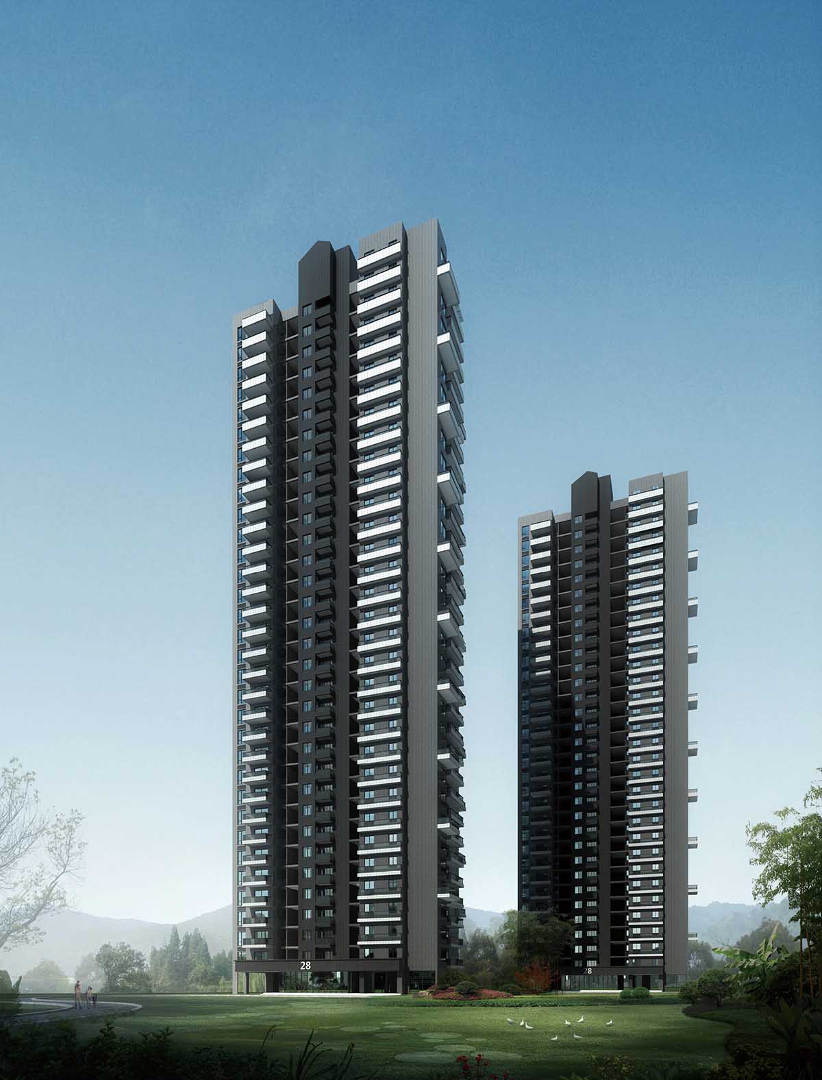 在高层住宅内可看到美丽壮观的柳江以及喀斯特地貌的景致山体,故在建筑中,每一户都有2.4米深,挑高3层的景观大露台,依建筑旋转而设置。建筑的色彩取材于当地独特的喀斯特地貌,形成了五种灰度,使建筑外观与周边自然环境产生了对话,两者之间相互叠加,富涵层次。